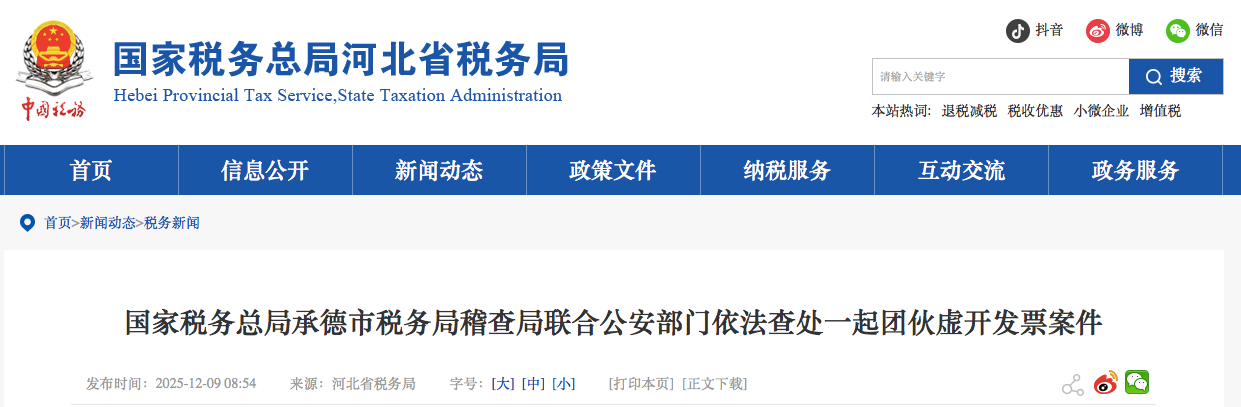 国家税务总局承德市税务局稽查局联合公安部门,依法查处河北权布科技有限公司等10户小规模纳税人团伙虚开增值税普通发票案件。