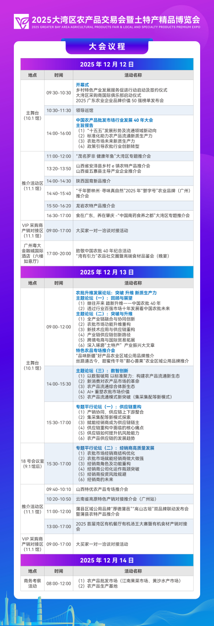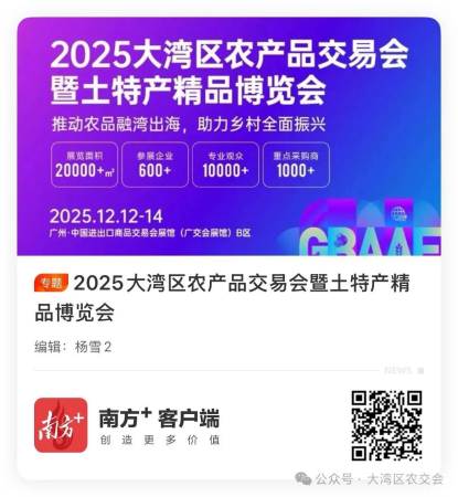 聚焦农业B2B交易的国际化展会——大湾区农产品交易会暨土特产精品博览会(简称“大湾区农交会”),定于2025年12月12日-12月14日在广州广交会展馆B区盛大举行。本届展会以“推动农品融湾出海助力乡村全面振兴”为主题,展览面积20000平方米,集结2000余款地方农特产,吸引超5000家全球采购商和超20000名国内外专业人士到会开展精准交易与深度交流,全力打造农产品领域的“广交会”级行业标杆盛会。