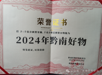 千优谷,为新型生态农业品牌,是响应东西部协作号召,从广州到贵州投资创立,农业产业化“重点龙头企业”贵州洋太公司旗下品牌,专注于贵州刺梨产业高质量发展,助力乡村振兴。千优谷产品涵盖千优谷刺梨果汁饮料、刺梨原汁、刺梨谷物脆、刺梨维C片、刺梨果脯、刺梨茶、刺梨精华面膜等系列,研发监制的“贵州刺梨茶”成为全国十五运会官方特许商品。已合作过的渠道及平台有Ole、华润万家、麦德龙、盒马、友谊商店、香港萬家、罗森等及京东、天猫、抖音、快手等电商平台,并入驻全国832平台、学习强国APP商城、国铁商城、南方电网、南方航空、美团、怡亚通、本来生活以及电信、银行、邮政等平台系统,正在有序开拓海外市场。